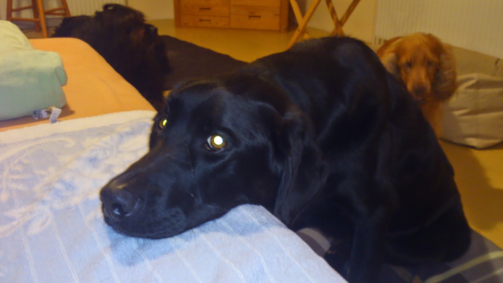 Dann müssen wir, obwohl uns nach Rennen und Springen ist, noch kurz auf unserer großen Decke liegen und warten, bis Sie uns die Halsbänder und Geschirre anlegt und wir ins Auto springen dürfen. Nun geht es auf zur zweiten gemeinsamen Jagd des Tages. Wir treffen dabei oft Hundefreunde oder lernen neue Hundefreunde (oder -feinde) kennen. Es ist nicht so interessant wie morgens, weil es wenig frische Gerüche von den Wald- und Feldtieren gibt.Aber dann suche ich eben nach Leckereien im Gebüsch, die andere Menschen oder Tiere hinterlassen haben. An manchen Tagen findet sich so einiges Schmackhaftes. Sie mag das überhaupt nicht und spricht und sieht mich dann böse an. Sie spielt aber auch meist mit uns und macht Spass, sodass die Jagd viel zu schnell vergeht und keine Zeit bleibt, nach köstlichem Unrat Ausschau zu halten. Wieder zurück im eigenen Revier wird Beute verteilt (wieder in Schüsseln oder im Garten). Egal wo, jeder versucht seinen Anteil so rasch als möglich zu verschlingen. Fast immer bin ich erster und "helfe" dann den anderen beim Suchen.